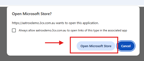 After you clicked on the 'Windows App' a Pop-Up opens, offering you to install the Windows App using a Link or to search for 3CX in the Microsoft Store: