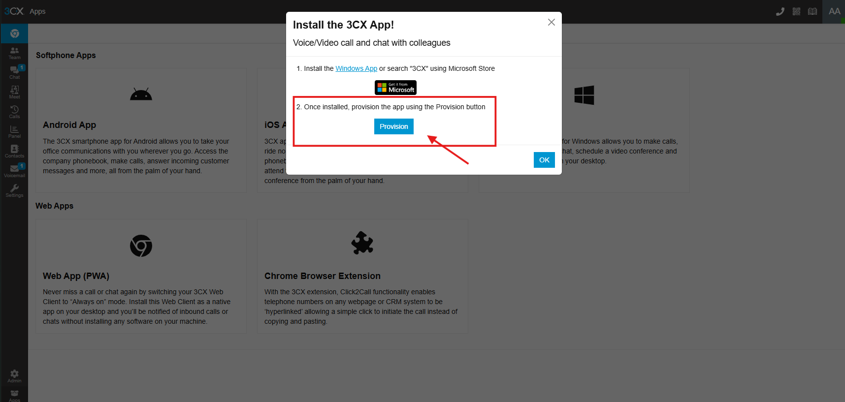 In the 3CX Provisioning Pop Up click on 'Provision' to have the App provisioned and register: